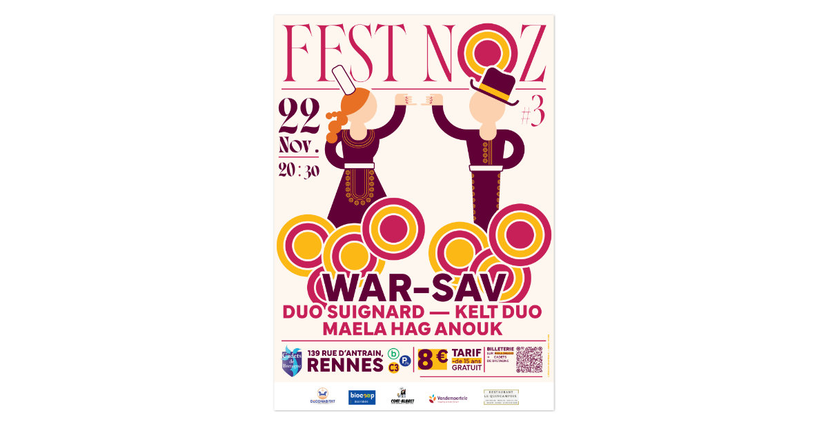 Il se déroulera le samedi 22 Novembre, de 20h30 à 1h, avec, au programme : War-Sav, Duo Suignard, Kelt Duo et Maela hag Anouk !