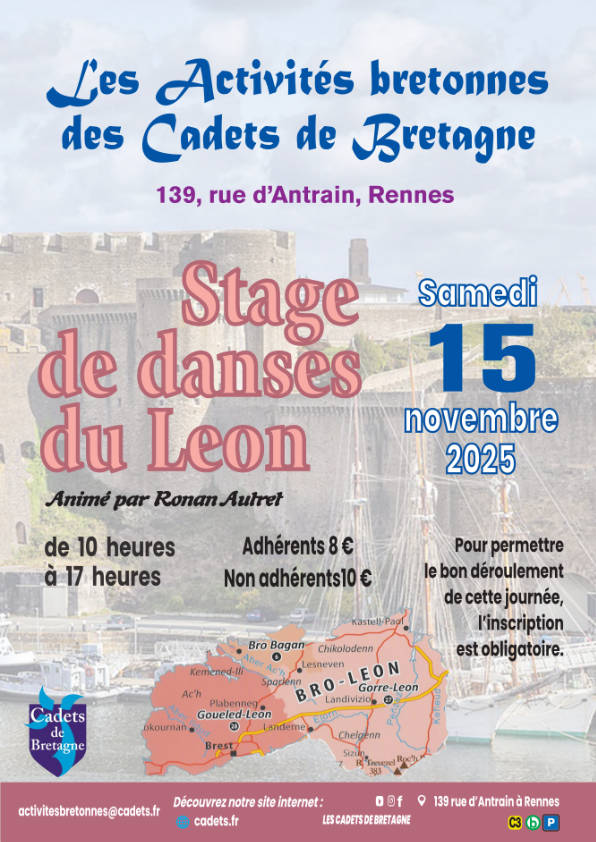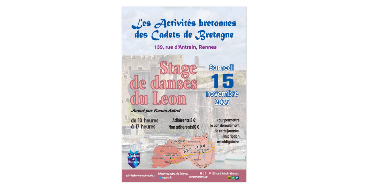 Stage de danses du Léon animé par Ronan Autret Stage de danses du Léon animé par Ronan Autret par 27 27 people viewed this event. S’inscrire à l’évènement To register for this event email your details to activitesbretonnes@cadets.fr Inscrivez-vous via le webmail : Gmail / AOL / Yahoo / Outlook Date et heure samedi 15 novembre 2025 - 10:00 à samedi 15 novembre 2025 - 17:00 Lieu - Catégorie de l’évènement Activités bretonnesStage Partager avec des amis Facebook Twitter Linkedin Xing Pinterest FACEBOOK TWITTER LINKEDIN MAIL