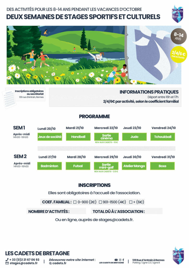 Les Inscriptions sont possibles dès à présent, à l’accueil ou par mail à stages@cadets.fr. L’inscription n’est effective qu’une fois le paiement reçu.