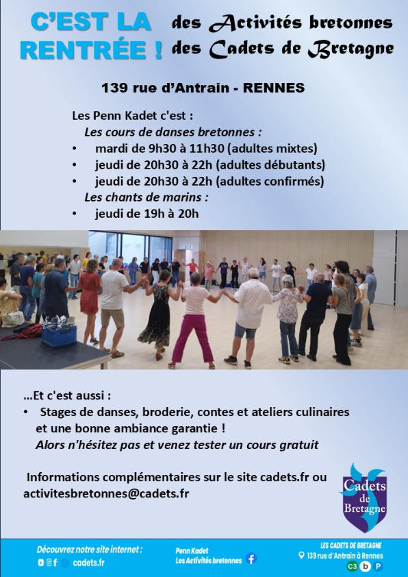 Que la danse bretonne vous soit inconnue ou que vous soyez un danseur déjà initié, vous saurez vous trouver une place dans nos cours débutants, mixtes ou confirmés dont l’ambiance chaleureuse et bienveillante est garantie ! À Rennes,  venez danser aux Cadets de Bretagne !