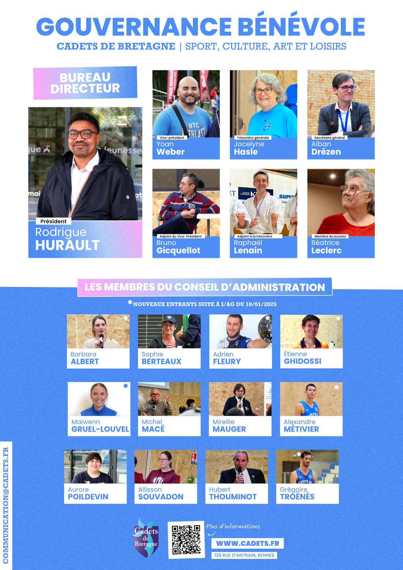 Les Cadets de Bretagne, comme toute association de loi 1901, sont gouvernés par un Conseil d’Administration bénévole. Ci-dessous, retrouvez la composition des différents organes de gouvernance, ainsi que les effectifs de l’équipe salariée missionnée pour appliquer le projet associatif décidé par les administrateurs de l’association.